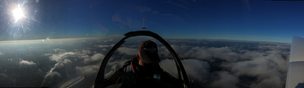 Ich nutze die Gelegenheit als Passagier und mache mit dem Smartphone einige Bilder und Videos – geniale Aussicht auf das Wettergeschehen an der Haardt. Die vereinzelten Wolken verdichten sich und ruck zuck hat uns die, aus Westen anrückende, dichte Wolkenfront erreicht. Harald macht eine größere Lücke in der Wolkendecke aus, geht in den Sinkflug und sticht durch die Lücke. Bei 800 Metern fängt er die ASK ab und geht wieder in den horizontalen Gleitflug über – das Spektakel hat ein Ende. Wir kommen im Raum Dackenheim raus und sehen unter uns den großen Golfplatz. Die Höhe haltend, steuert uns Harald in Richtung Norden. Über dem Höhenzug bei Mertesheim wird es dann noch einmal etwas unruhiger, wobei der Variometer recht aktiv ist. Mein Frühstück macht sich bemerkbar, aber es bleibt alles da wo es hingehört. Das ruppige Lüftchen haben wir überwunden und umrunden westwärts (Donnersberg-Seite) unseren Flugplatz. Aus Norden kommend setzt Harald zur Landung an und nutzt den Schwung um bis vor den Hangar zu rollen.