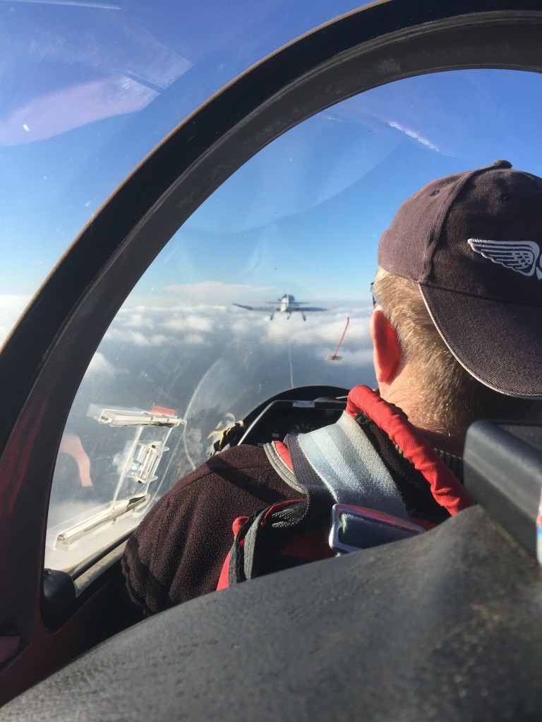 Dann geht alles ganz schnell, denn Harald „juckt“ es – er will nach oben. Während Harald noch schnell die Steuerung umbaut, machen Max und ich den Startcheck. Wir helfen Harald aus dem Rolli ins Cockpit und dann – zwei Mann, ein Blick – da ist „es“ – eine offene Haube und ein leerer Sitz. Nachdem Max nicht reagiert (zum Glück), schnapp ich mir den Fallschirm, Gurte eingeklinkt, Füße über die Bordwand und rein in den leeren Sitz. Max hilft mir die Gurte anzulegen – irgendwie tut er mir leid – sorry Max. Mein Egoismus ist stärker, Haube zu, Gurte fest – „ready for take off“. Der Motor der „REMO“ vor uns nimmt Drehzahl auf und wir setzen uns in Bewegung. Ein paar Meter über die Wiese und schon geht der F-Schlepp in Richtung Süden – smarter Start.
