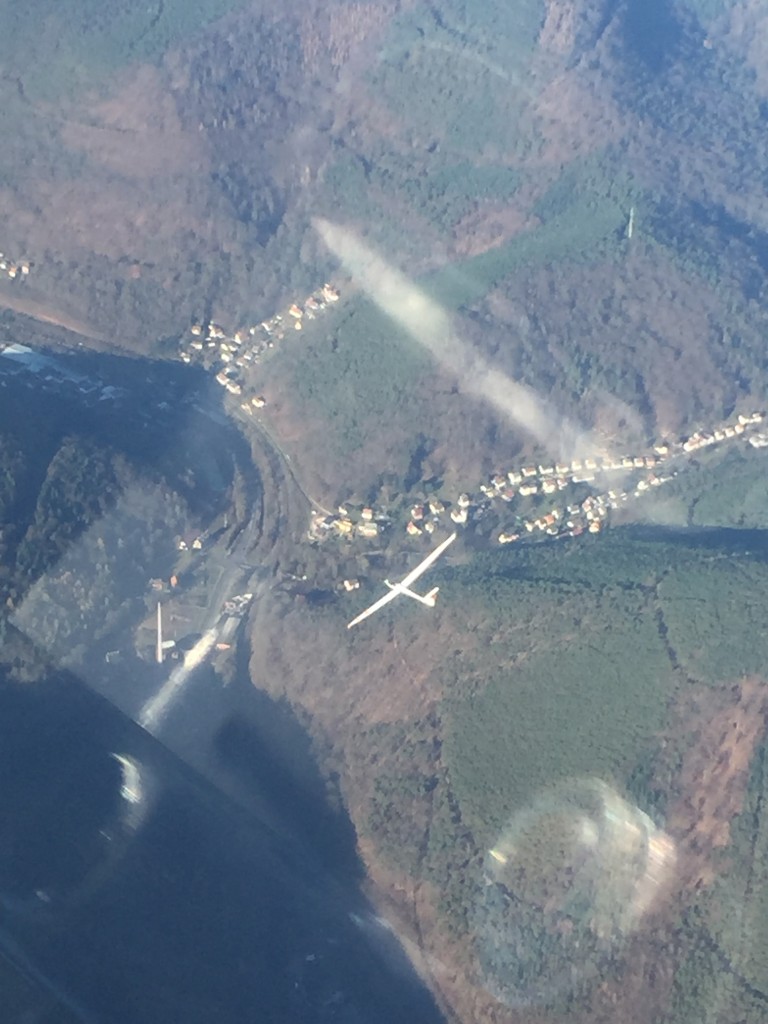 Unser Ziel ist die Haardt, ein Mittelgebirgszug, der einen Teil der westlichen Begrenzung des Oberrheingrabens bildet. Stetig klettert der Höhenmesser. Im Raum Neustadt an der Weinstraße ist es dann soweit, 1.100 m Höhe und wir klinken uns aus – danke Ralf, der macht sich Richtung Norden mit einem „… viel Spaß …“ auf den Heimweg. Harald richtet die ASK im Wind aus und erklärt mir wie und warum er etwas tut, aber mit der Thermik ist er nicht wirklich zufrieden. Wir drehen unsere Runden im Raum Neustadt / Hambacher Schloss und machen unter uns ein weiteres Segelflugzeug aus – wir sind nicht alleine.